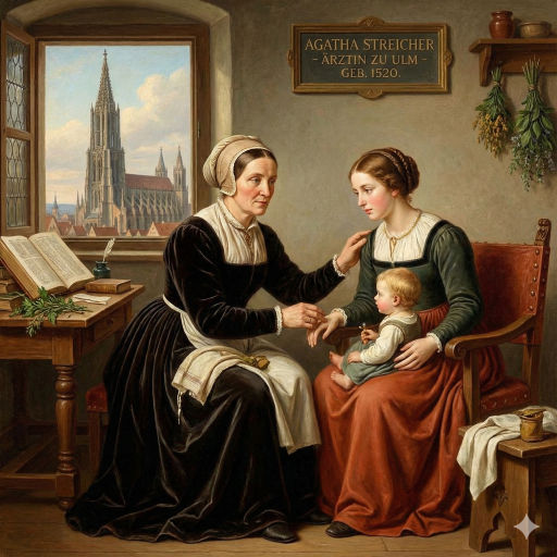 Im Jahr 1520 wird Agatha Streicher geboren. Sie war die erste anerkannte deutsche Ärztin und wirkte in Ulm.